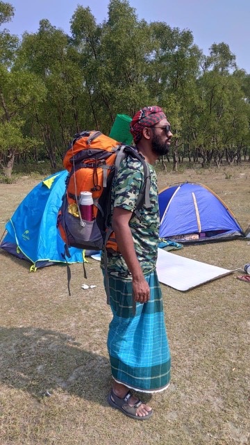 ব্যাকপ্যাক গুছিয়ে ক্যাম্পের সামনে দাড়িয়ে