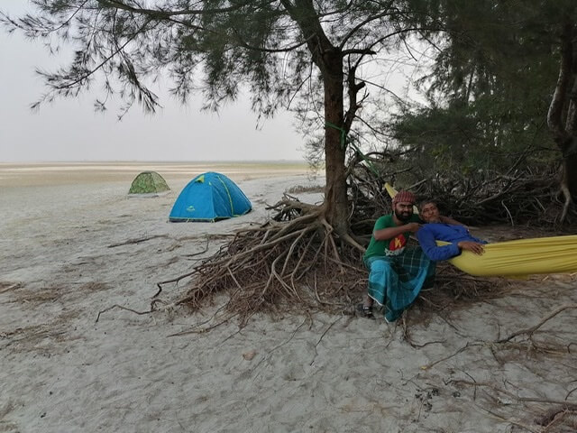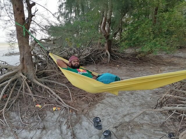 তাবু লাগিয়ে পাশে দুই গাছের ফাঁকে আমার হ্যামকটা ঝুলিয়ে দিলাম৷ যে যার ইচ্ছামত ঝুলাঝুলি আর ফটোসেশান করল৷ আমি গিয়ে বাবুল নানাকে ধরে নিয়ে আসলাম নৌকা থেকে৷ আজকে নানাকে হ্যামকে ঝুলাবো৷